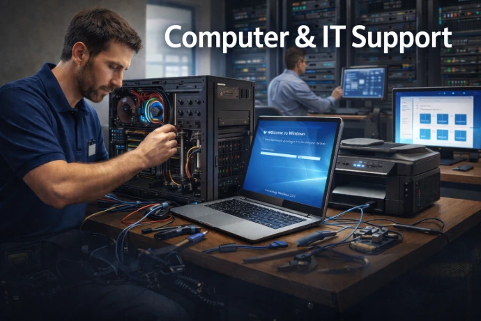 We provide complete computer support services, including custom PC and server assembly, hardware repair, Windows and application installation, and full system setup. We also configure computers on local networks, connect printers and peripherals, and ensure everything works smoothly together for home and business environments.